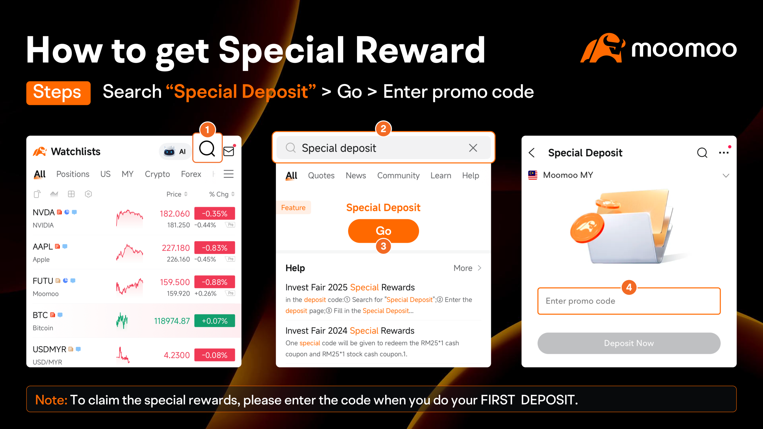 Join Moomoo with Me! Free Apple Shares await* Before making your first first deposit, search for “Special Deposit” and enter your Exclusive Code “IM25” on the deposit page.